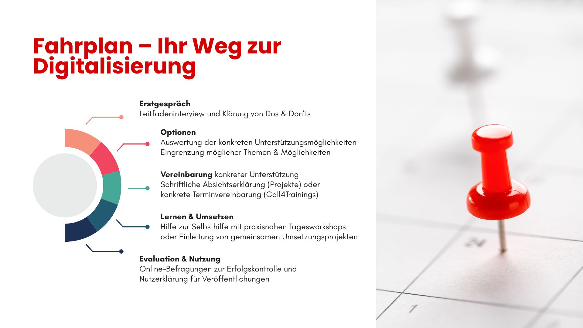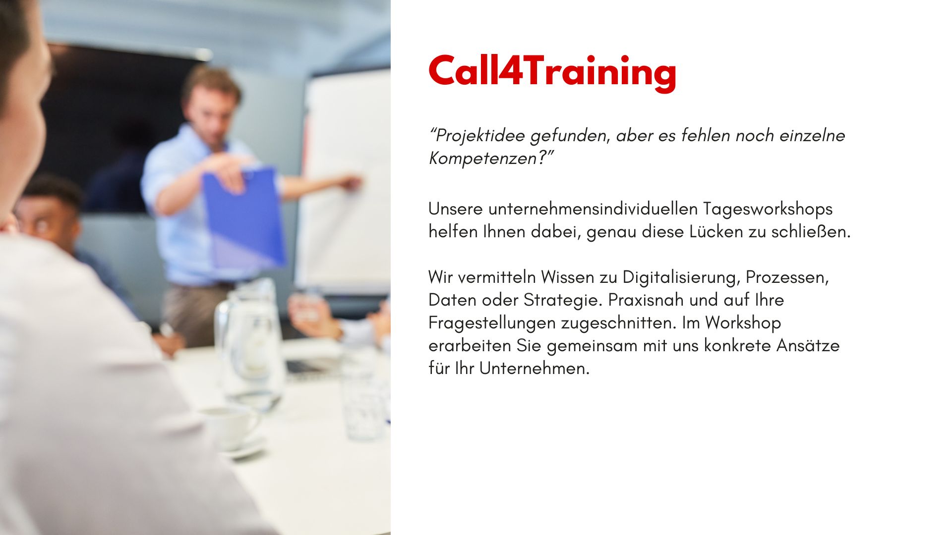 Zum Portfolio unseres Zentrums gehören kostenfreie Formate, die speziell auf individuelle Digitalisierungsfragen einzelner Unternehmen zugeschnitten sind. Möglich sind so genannte Call4Trainings direkt in Ihrem Betrieb zu Themenfeldern der Digitalisierung. Die Inhalte werden dabei dem konkreten Bedarf Ihres Unternehmens angepasst.