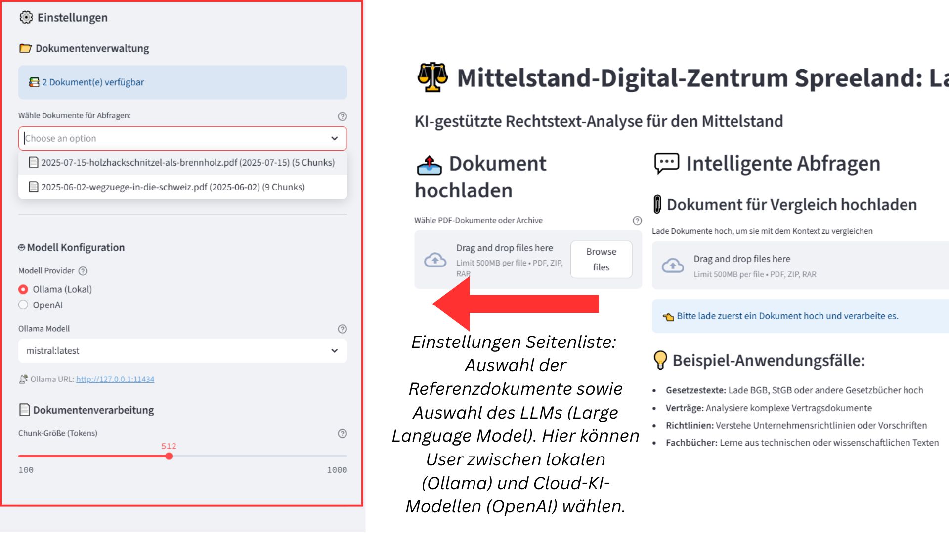 LLM-Integration: Das System unterstützt sowohl lokale Modelle über Ollama als auch Cloud-basierte Modelle via OpenAI API. Ein spezialisiertes Prompt-Template stellt sicher, dass Antworten präzise Quellenangaben mit Paragraphen und Seitenzahlen enthalten.