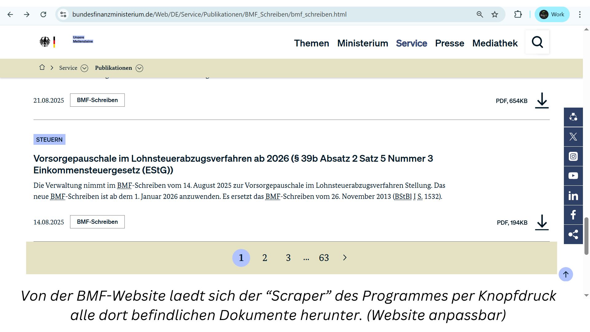 BMF-Scraper: Ein automatisierter Scraper wurde implementiert, der die Website des Bundesfinanzministeriums durchsucht und neue BMF-Schreiben herunterlädt. Der Scraper implementiert intelligente Retry-Mechanismen bei Netzwerkfehlern. Die heruntergeladenen Dokumente werden automatisch mit Metadaten wie Veröffentlichungsdatum versehen.