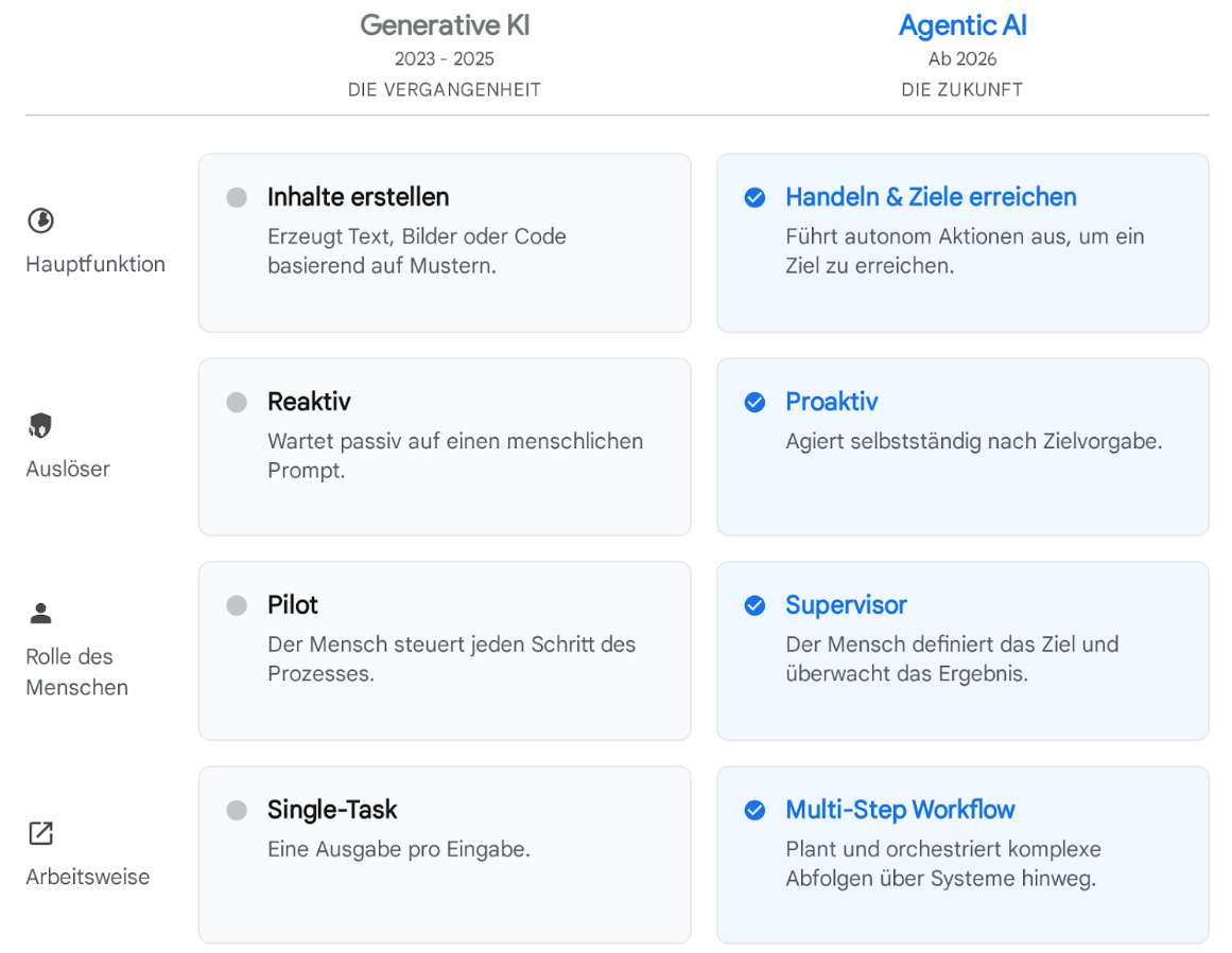 Die Jahre 2023 bis 2025 waren geprägt von der Entdeckung der Generativen KI. Wir staunten über die Fähigkeit von ChatGPT und Co., auf Knopfdruck Texte, Bilder und Code zu erstellen. Diese Phase des Experimentierens war wichtig, doch nun vollzieht sich ein Paradigmenwechsel, der in seiner Wirkung mit der Einführung des Internets vergleichbar ist: der Aufstieg der Agentic AI, der „handelnden KI“.